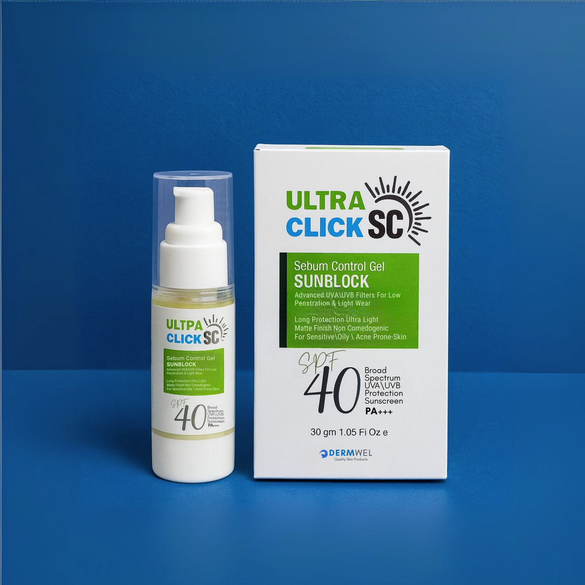 Ultra Click SC Sebum Control Gel is a lightweight, non-comedogenic sunscreen specially designed for people with oily and acne-prone skin. Its advanced UVA/UVB filters provide broad-spectrum SPF 40 protection, shielding your skin from harmful rays while keeping excess oil under control.